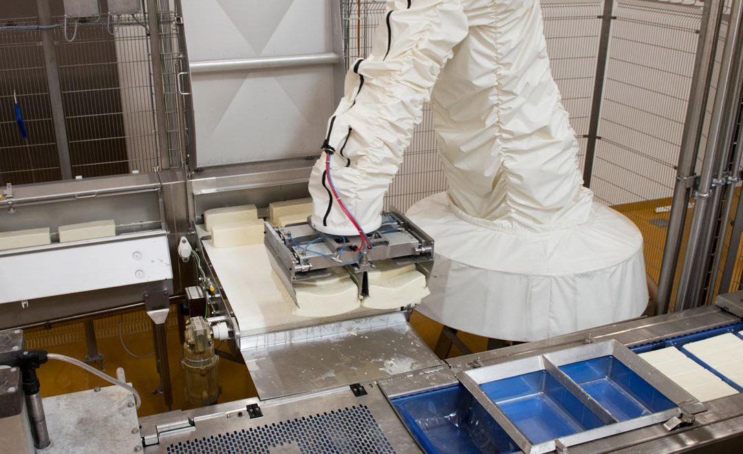 The automation solution includes 4 robots, of which 2 are reused from the dairy's previous production, and 2 are new Kawasaki robots from BILA. The systems handle mozzarella in the packaging and palletising phases.