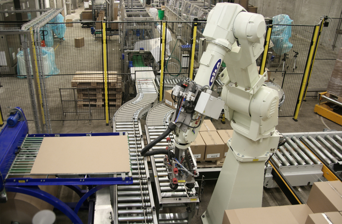 The solution was a robot system from BILA that automatically sorts and palletises boxes from up to 4 production lines. The system can handle up to 15 boxes/minute per robot.