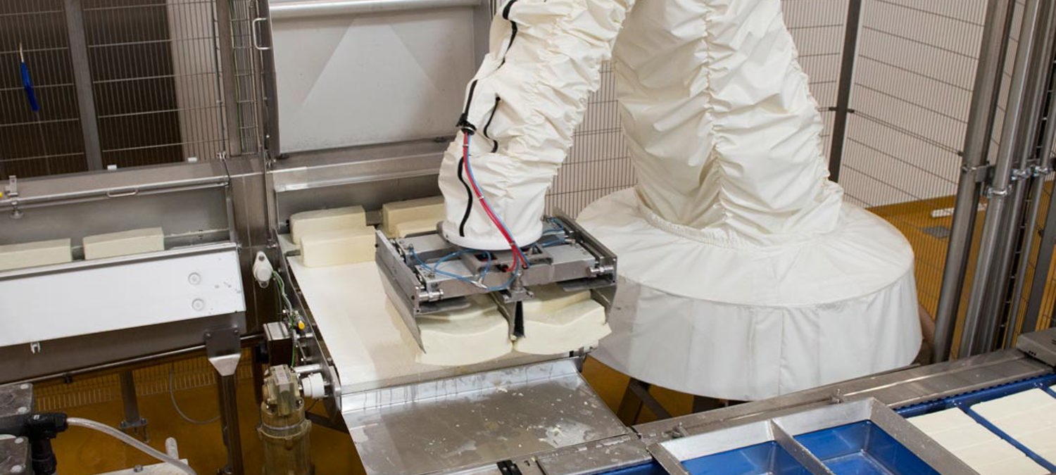 The automation solution includes 4 robots, of which 2 are reused from the dairy's previous production, and 2 are new Kawasaki robots from BILA. The systems handle mozzarella in the packaging and palletising phases.