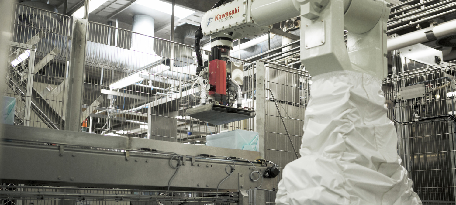The chosen solution was a Kawasaki robot equipped with a vacuum suction tool, capable of palletising margarine blocks, cartons for margarine sheets, and cardboard boxes on EUR and UK pallets.